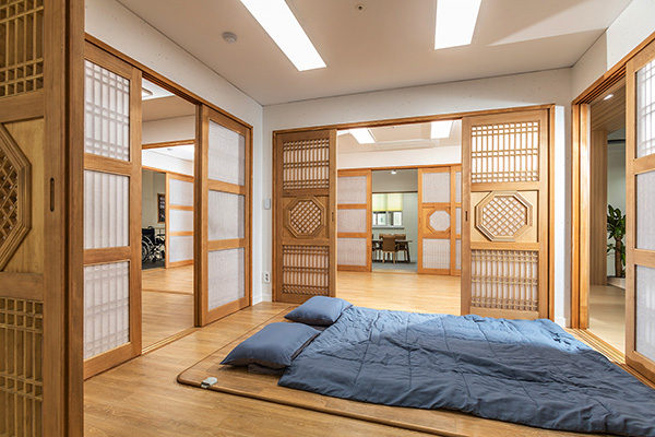 대교뉴이프 '인천미추홀 통합센터'는 현대적으로 해석한 전통의 아름다움을 바탕으로 이용자 어르신들을 최우선적으로 고려하였습니다. 전용 약 100평형의 넓은 공간을 바탕으로 주생활공간을 구성하고 선택형 프로그램, 사생활이 존중되는 휴식,건강관리 등 필요한 서비스를 독립적인 공간에서 이용할 수 있도록 배려한 점이 돋보입니다.