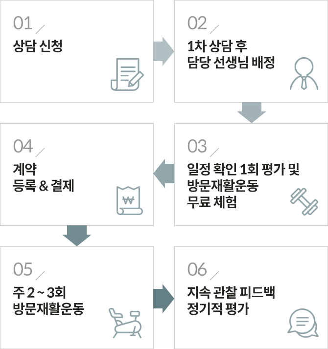 관절 질환 환자는 수술 전/후나 비수술 치료 과정에서도 증상과 질환에 맞춘 꾸준한 재활운동이 필요합니다.